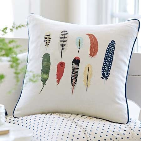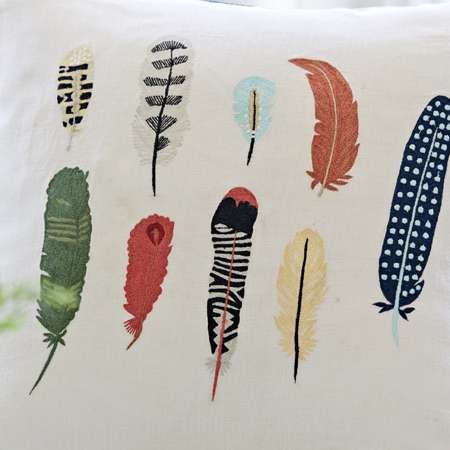 This handsome assortment of colorful feathers is embroidered onto a cream linen base trimmed in indigo linen cording. Filled with a 100% white feather and down insert. Machine washable. Size: 18”x18”