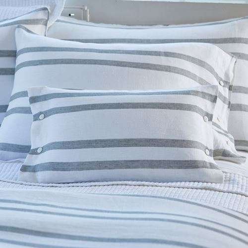 Easy-breezy. Woven from an exceptional Belgium linen, this sage gray and cream striped duvet collection is incredibly soft and versatile. Side button closure. Machine washable. Size: 13″x 18″